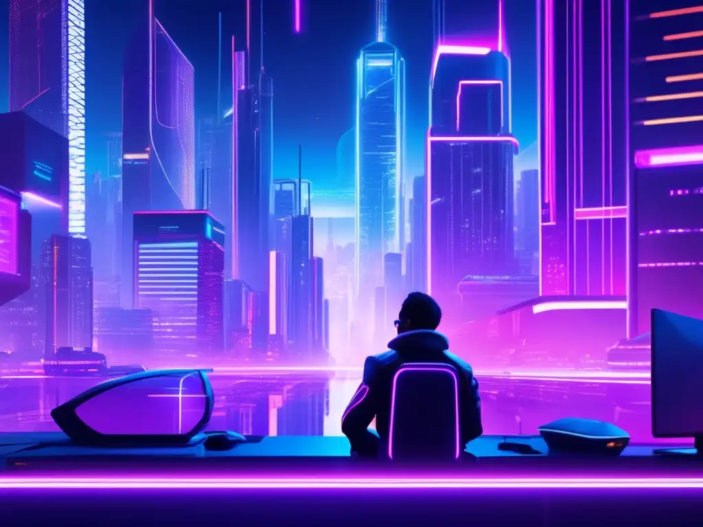 Ciudad futurista con rascacielos iluminados por luces neón