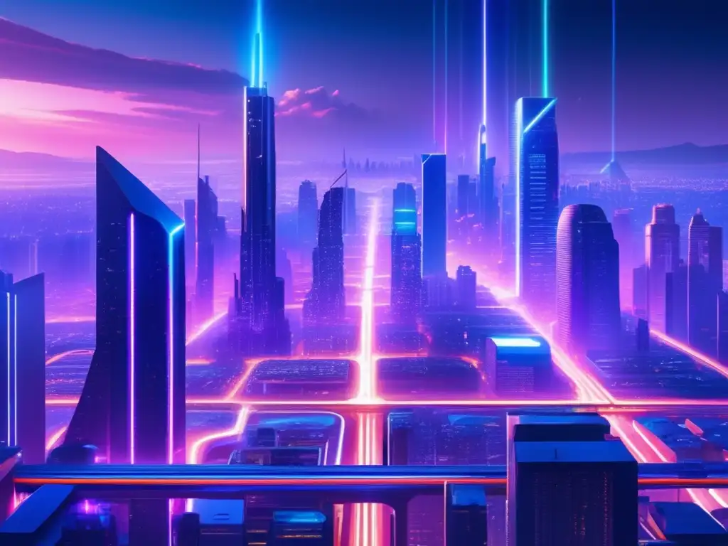 Ciudad futurista al anochecer, con rascacielos distorsionados y luces de neón